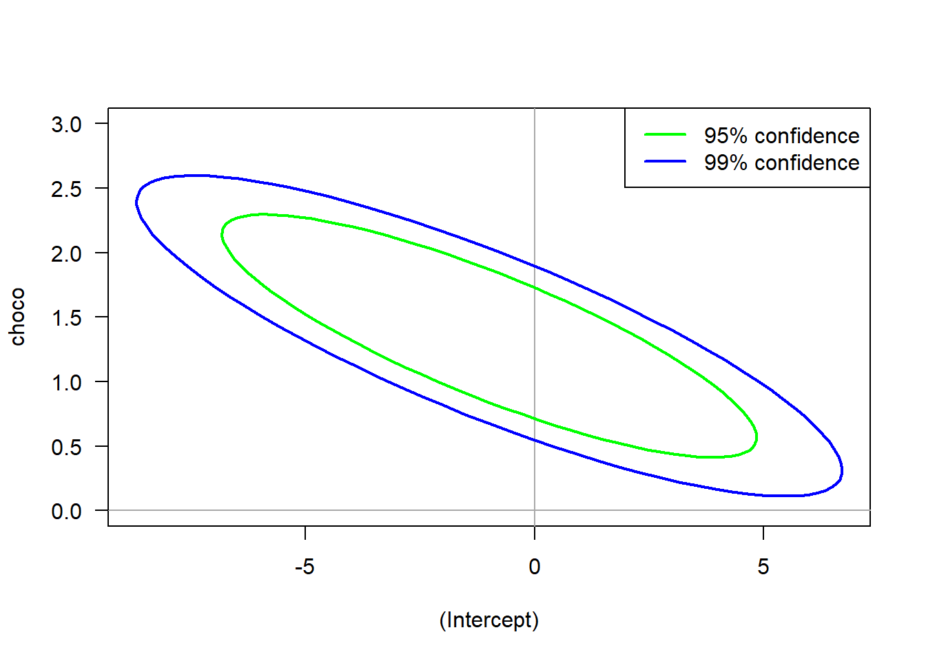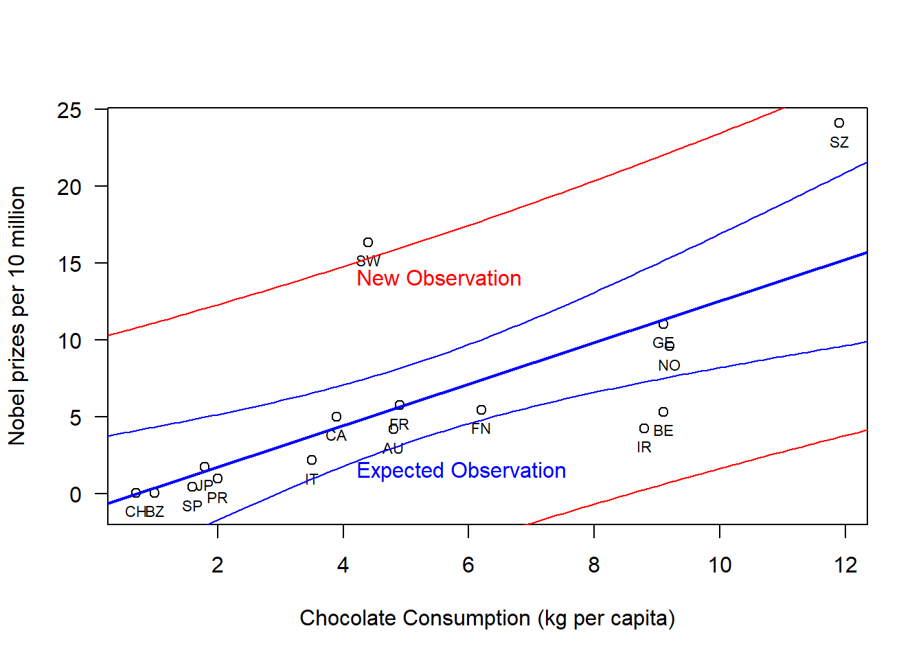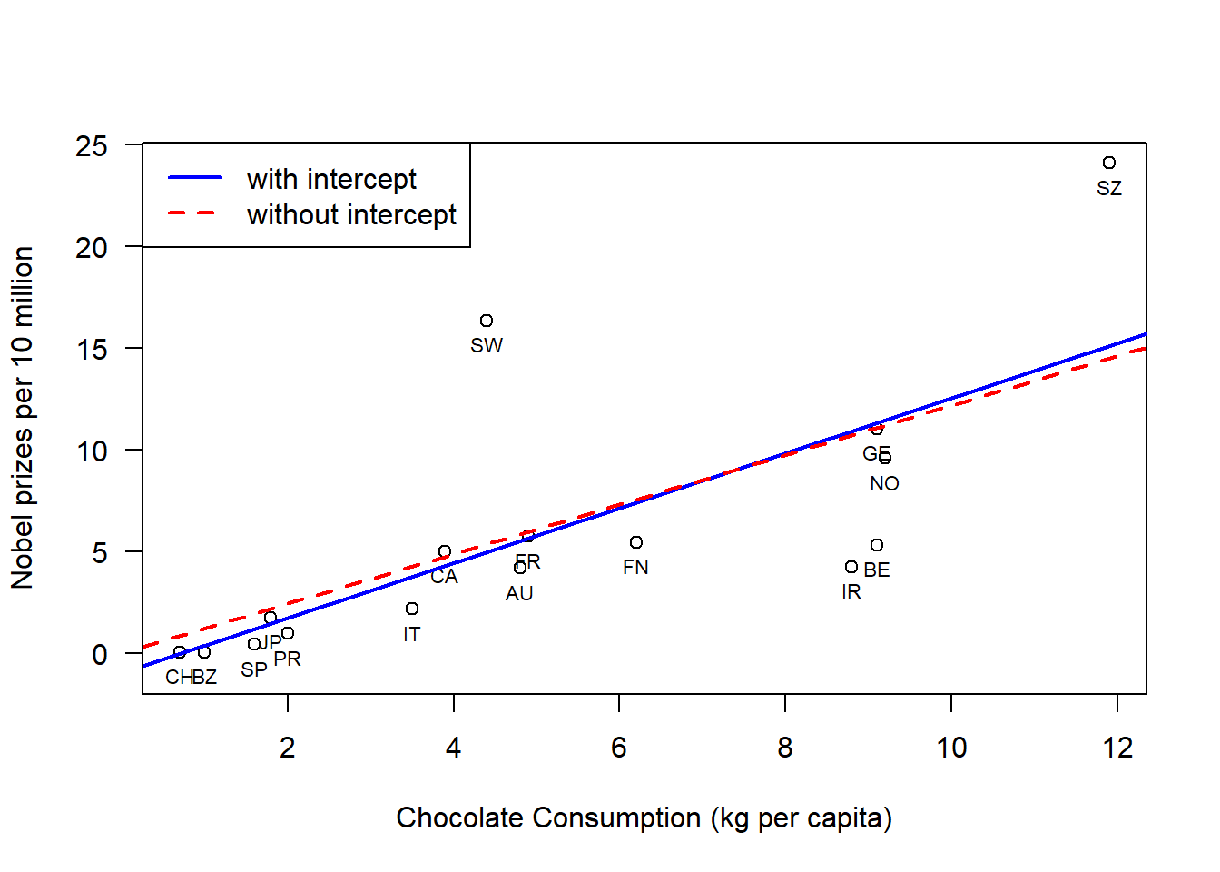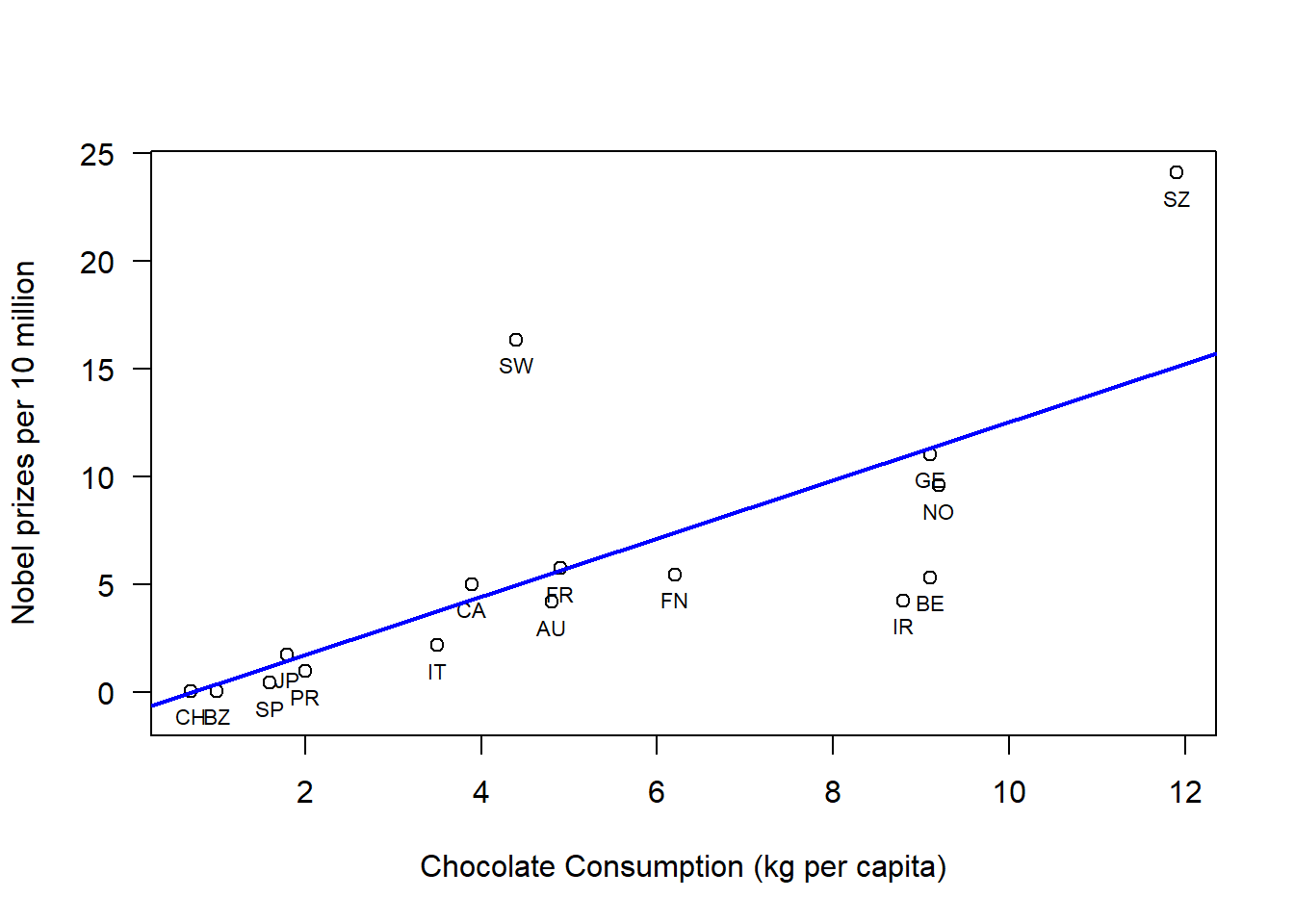 # Read in Tabledat =read.table("data/chocoTable.r");# Plot dataplot( dat$choco, dat$nobel,xlab="Chocolate Consumption (kg per capita)",ylab="Nobel prizes per 10 million",las=1,#xlim=c(0,max(dat$choco)+1),ylim=c(-1,max(dat$nobel)));# Label datatext(x=dat$choco, y=dat$nobel,labels=dat$abbrev, pos=1,cex=0.7)# Construct a linear modellmDat =lm( nobel ~ choco, data = dat );# plot regression lineabline(lmDat,col='blue',lwd=2)